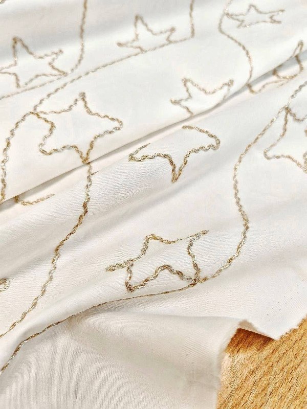 ХЛОПОК, пр. Италия Арт 5736 Шир 143 см 96 % хлопок, 4% эластан Цена 2190 рм Костюмный хлопок,бело - молочного цвета с эластаном и вышивкой золотым шнуром Для жакета, юбки, бомбера, курточки в джинсовом стиле и тд...
