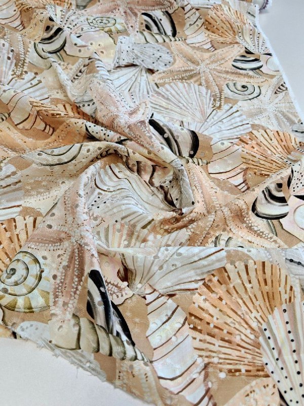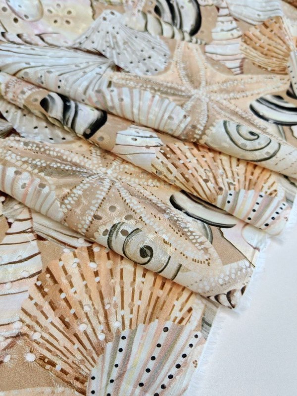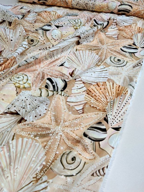 ШИТЬЁ От VERSACE пр. Италия Арт 6288 Шир 143 см 100% хлопок Цена 3600 рм Эффектный принт в нежных песочные тонах.. морские звезды и раковины так и зовут к морю... Шьём.. Платье, сарафан, блузу, топ, юбку