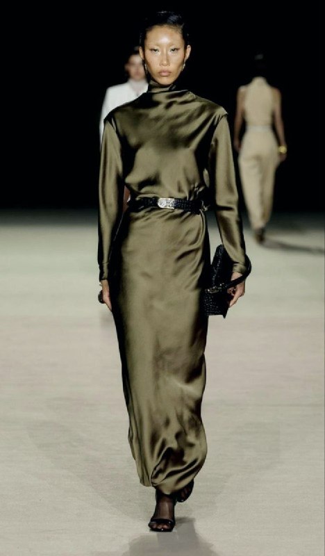 Красиво, тяжело ниспадает, подчёркивая достоинства силуэта