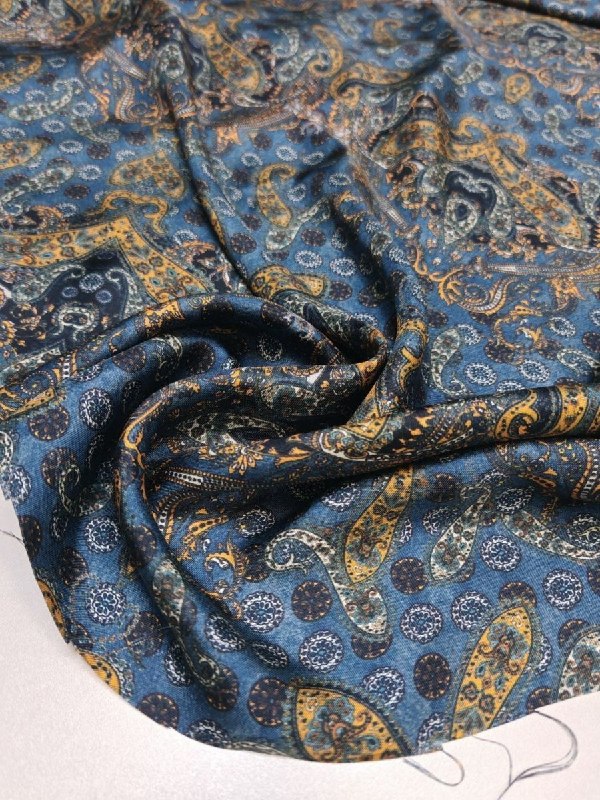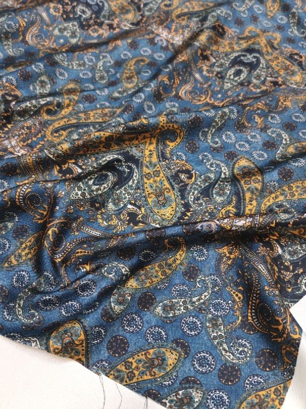 НАТУРАЛЬНЫЙ ШЁЛК, Alta Moda Арт 6723 Шир 138 см 100% натуральный шёлк Цена 4900 рм Эффектный шёлк, твил В основе принт Деним И "огурчики" на нём Пластичный, текучий Для роскошной блузы, юбки, топа или платья