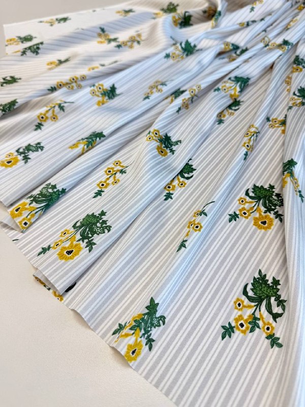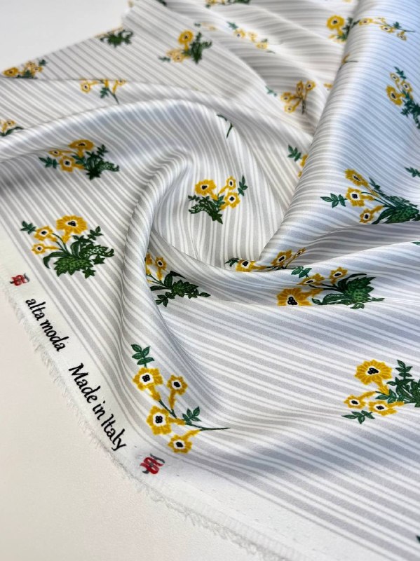 НАТУРАЛЬНЫЙ АТЛАСНЫЙ ШЁЛК DOLCE & GABBANA от ALTA MODA Арт 7014 Шир 133 см 95% натуральный шёлк 5% эластан Цена 5300 рм Чудесный атласный шёлк в СЕРУЮ полоску с небольшими ЖЕЛТЫМИ цветочками Пластичный, струящийся, легкое контурное просвечивание Идеален для платья, сарафана, блузы, юбки, топа или летнего комплекта