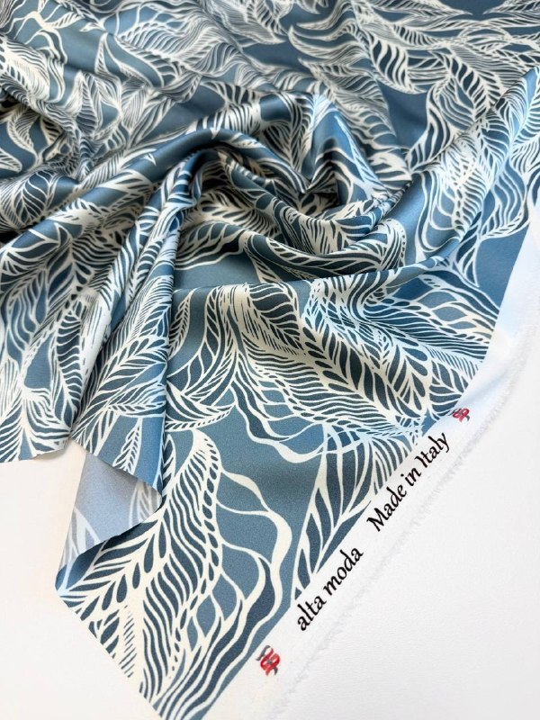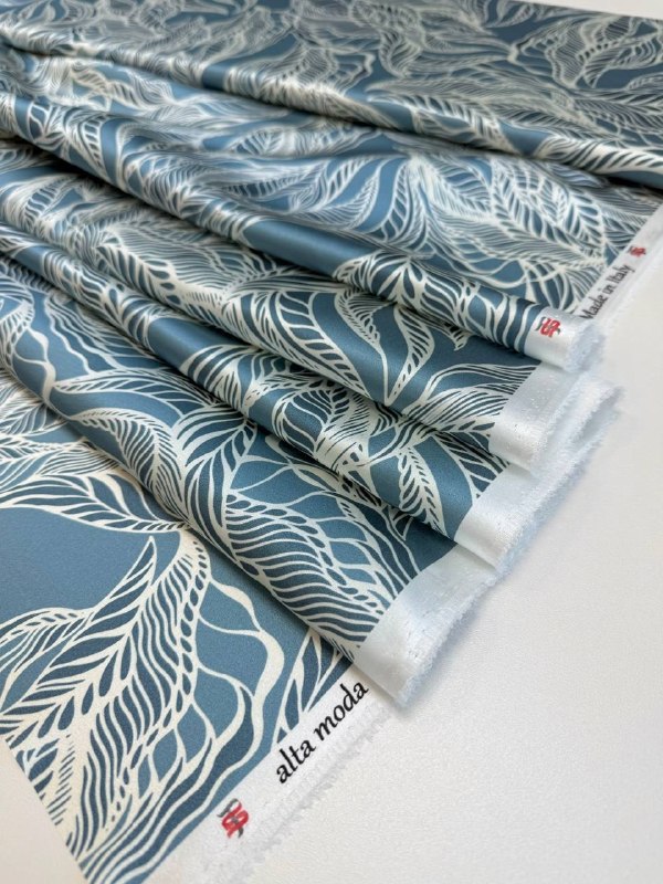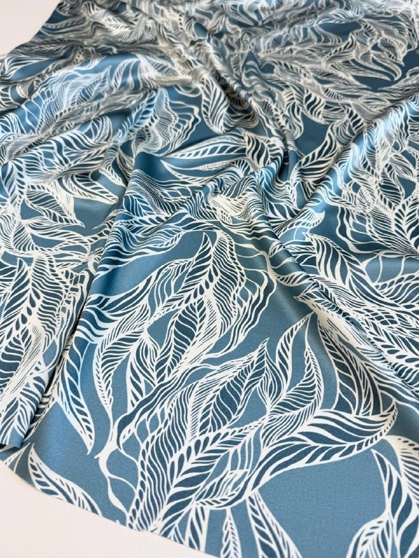 Прекрасный шёлк с красивым принтом из листьев в СЕРО-ГОЛУБЫХ тонах