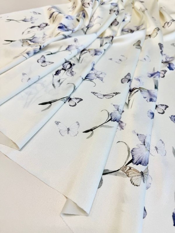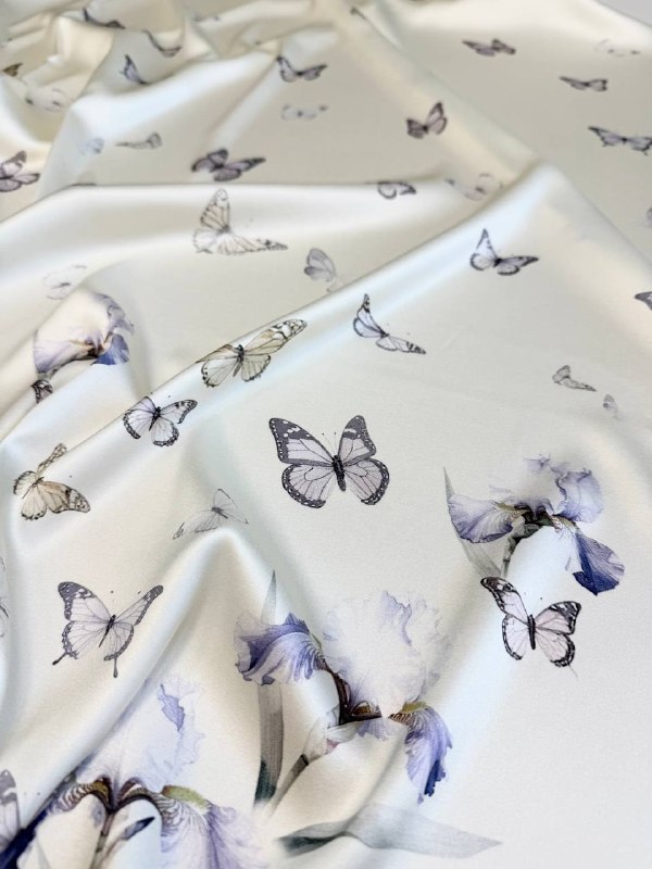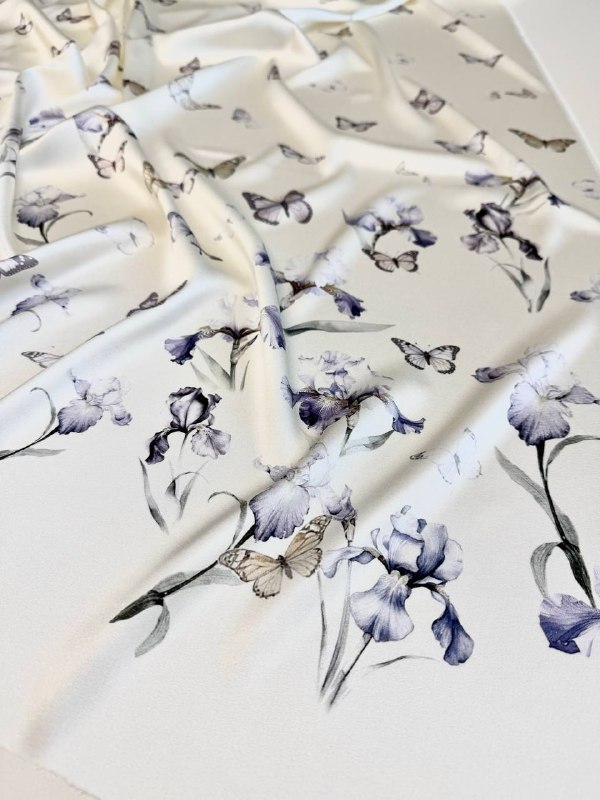 Атласный шёлк в купонах с нежными ирисами и бабочками на МОЛОЧНОМ фоне